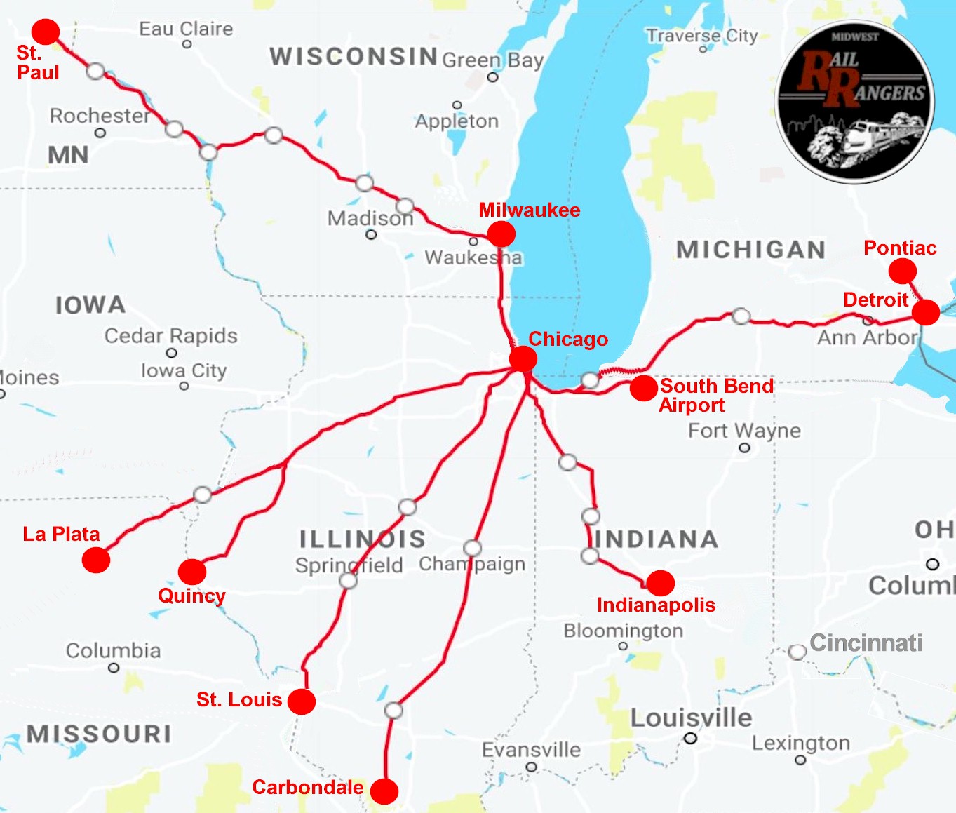 Acela, Acela Express, Amtrak, Blue Water (SM), California Zephyr, Capitol Limited (SM), Cardinal, Carl Sandburg, City of New Orleans, Coast Starlight, Empire Builder, Hiawatha, Hoosier State, Illini, Illinois Zephyr, Lake Shore Limited, Lincoln Service, Northeast Regional (SM), Pere Marquette, Saluki, Southwest Chief, Sunset Limited, Texas Eagle, and Wolverine are trademarks and service marks of the National Railroad Passenger Corporation (Amtrak). The NRPC, nor Amtrak, have any affiliation with the Midwest Rail Rangers Corporation, Outside the Rails Route Guidebooks, or Flashing Yellow Guidebooks.