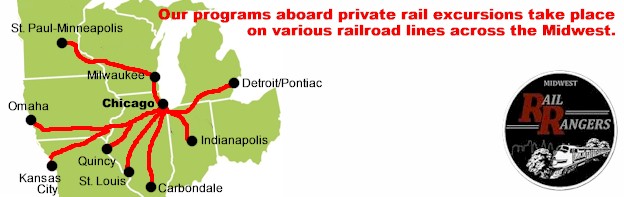 On occasion, the Midwest Rail Rangers also present our fun and entertaining educational programs aboard private rail excursions. These trips often feature luxurious observation cars from the 1950s/1960s, which are attached to regularly scheduled Amtrak passenger trains. Learn about the people, places, and history passing by outside your windows with narration from the Rail Rangers -- while experiencing what the Golden Age of Railroading was all about. Private rail car trips often depart from Chicago Union Station and span out across a seven state region of the Midwest; popular destinations include Milwaukee, St. Paul-Minneapolis, St. Louis, Quincy, Carbondale, Kansas City, and Michigan.