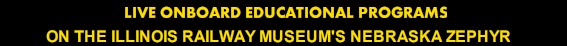 We are excited that the Illinois Railway Museum, in Union, Illinois (60 miles northwest of Chicago), also agrees that sharing the history of the Burlington Zephyrs is an important mission. The agreement made allows for Midwest Rail Rangers interpretive guides to present onboard educational talks to passengers approximately three to four days per year. Special photographs and historical items from the Zephyrs will also be made available onboard the train for viewing. The Midwest Rail Rangers will post the dates to our programs in the "Upcoming Programs" tab on the left. We also encourage everyone to visit the Illinois Railway Museum any day they are open, as it houses one of the finest collections of equipment anywhere in the world.