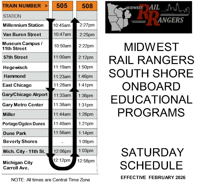 Midwest Rail Rangers programs on the South Shore Line operate on eastbound Train #505, which departs Chicago Millenium Station at 10:45am, and arrives at Michigan City Carroll Avenue Station at 12:12pm. We also present a westbound program on Train #508, which departs Michigan City Carroll Avenue Station at 12:58pm, and arrives at Chicago Millenium Station at 2:27pm CT. Here is a complete listing of station stops and our program schedule.