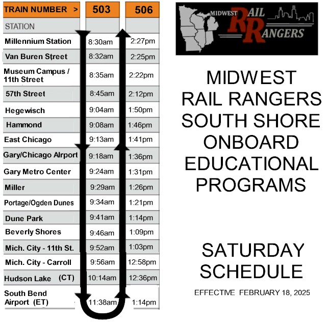 Midwest Rail Rangers programs on the South Shore Line operate on eastbound Train #503, which departs Chicago Millenium Station at 8:30am CT, and arrives at South Bend Airport Station at 11:38am ET. We also present a westbound program on Train #506, which departs South Bend Airport Station at 1:14pm ET, and arrives at Chicago Millenium Station at 2:27pm CT. Here is a complete listing of station stops and our program schedule.