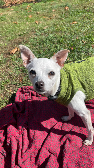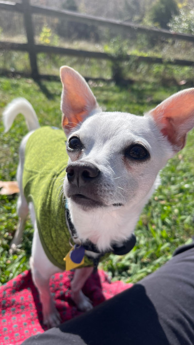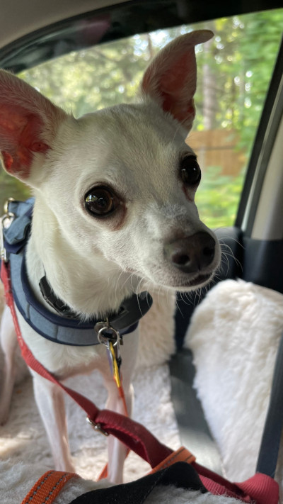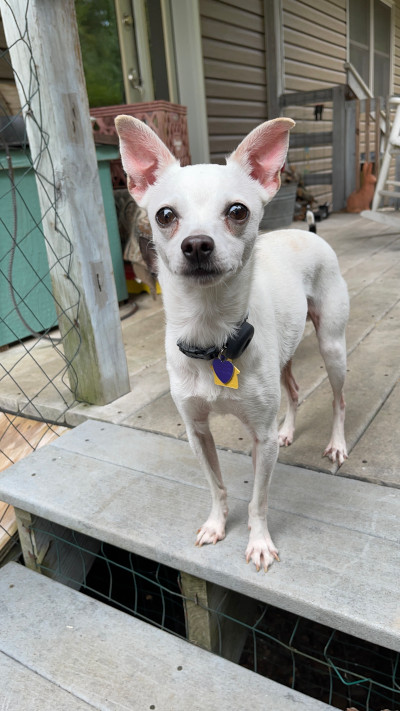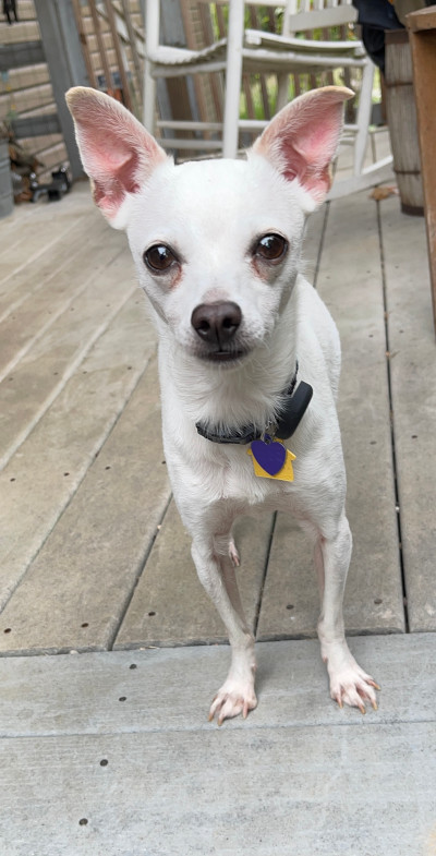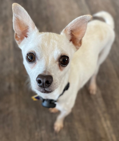 Hello, my name is Kai, rhymes with sky. I’m approximately 2 years old and a male. I have a beautiful white coat with soft tan makings and soft brown eyes. Everyone thinks I’m a Chihuahua mix with a little bit of Italian Greyhound because I have long elegant legs. I weigh just under 12 pounds.